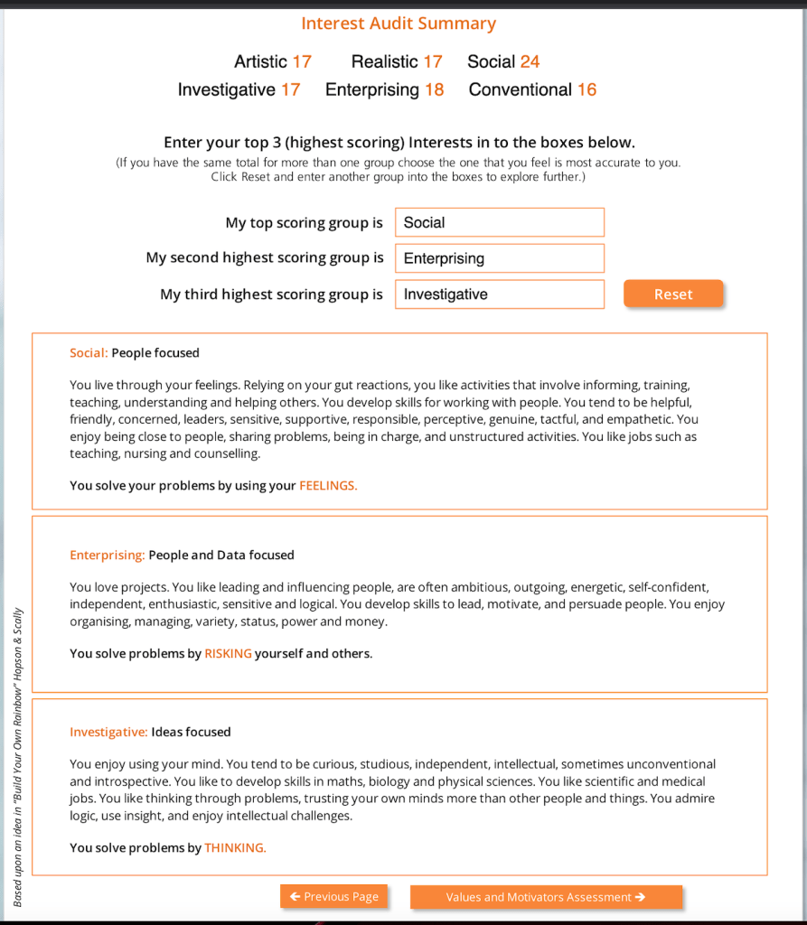 According to the Interest Audit summary, it can be seen that there is a high interest in social where the skills I have are more social and also focus on ideas in the brain so that they can develop them to the fullest